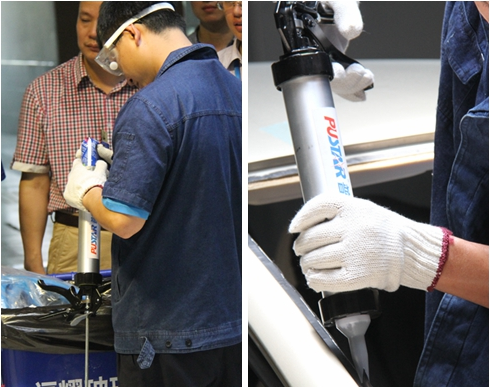 公司技术工程师就“汽车玻璃粘胶使用及注意事项”课程作了专业的讲解,并引导学员进行了现场的实际操作。
