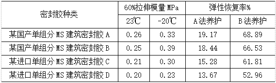 单组分MS建筑密封胶的基础聚合物反应活性相对较低,彻底反应完全所需时间相对较长,如果标准给定的养护时间不够,基团反应不彻底,密封胶内部交联程度不够,弹性恢复率表现较低。采用JC/T 881-2001[7]对比4款国内外MS建筑密封胶弹性回复率测试结果可知,按照A法养护,测试结果(见表3)不符合标准要求,采用GB/T 22083-2008[8]对单组分MS建筑密封胶进行分级,最高只能符合该标准中的12.5 P类型产品要求,结果为塑性材料,而实际的MS建筑密封胶为弹性密封胶,明显欠妥;如果按照B法养护,弹性恢复率可达到60%以上,符合GB/T 22083-2008标准中的20LM类型产品要求,测试结果为弹性材料。综上所述,由于现今没有专门针对MS建筑密封胶应用的标准,套用按应用领域或分级界定的标准明显欠妥,使得单组分MS建筑密封胶在建筑市场领域,尤其是PC外墙密封领域推广异常困难。