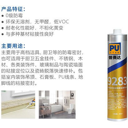 9283 环保改性硅烷家装密封胶是一种单组分湿气固化改性硅烷胶,具有良好的密封性能和内聚力,具有防霉功能。对基材无腐蚀、无污染,对环境无污染,对五金配件、不锈钢、多数塑料等多种材料具有良好的粘接性能。