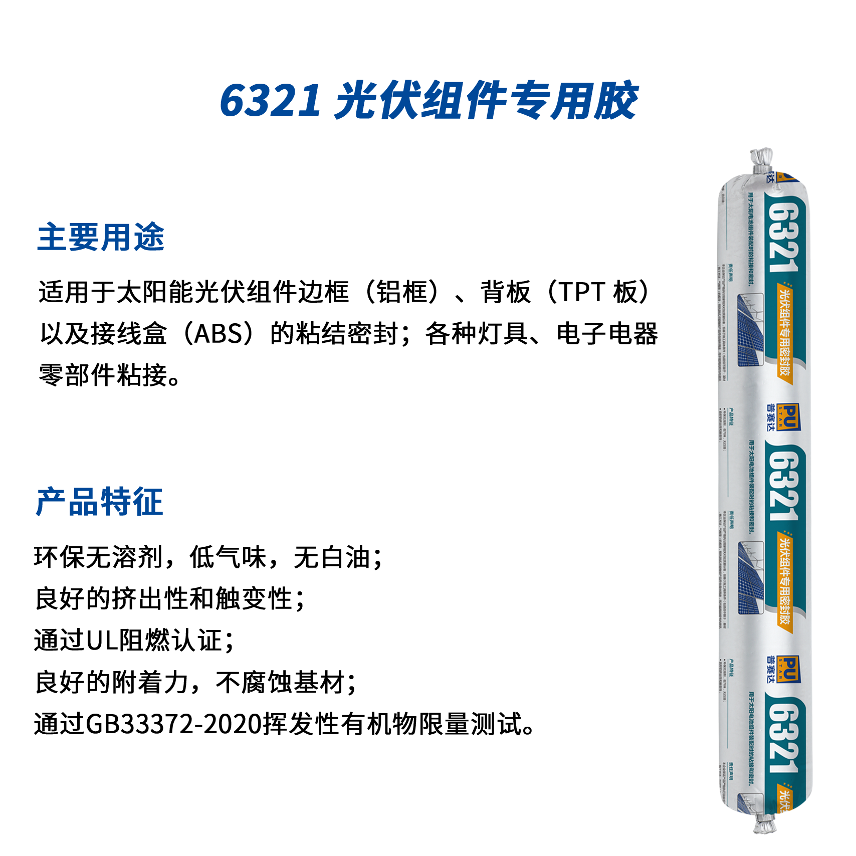 6321 是一种单组分湿气固化中性硅酮密封胶,具有良好的密封性能和内聚力。该产品对铝材,钢化玻璃,复合背材,接线盒材料有良好的粘结性,不腐蚀接线盒材料,可用于太阳能光伏板组件边框以及接线盒的粘结密封。