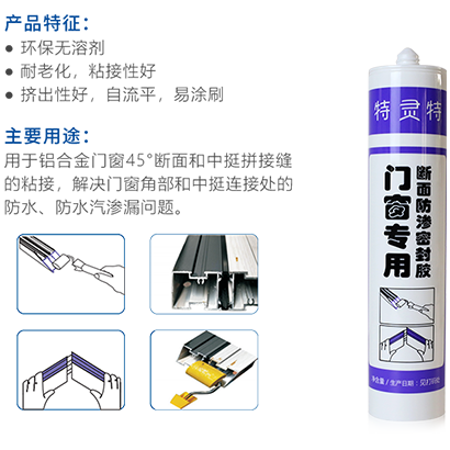 用于铝合金门窗45°断面和中挺拼接缝的粘接,解决门窗角部和中挺连接处的防水、防水汽渗漏问题。